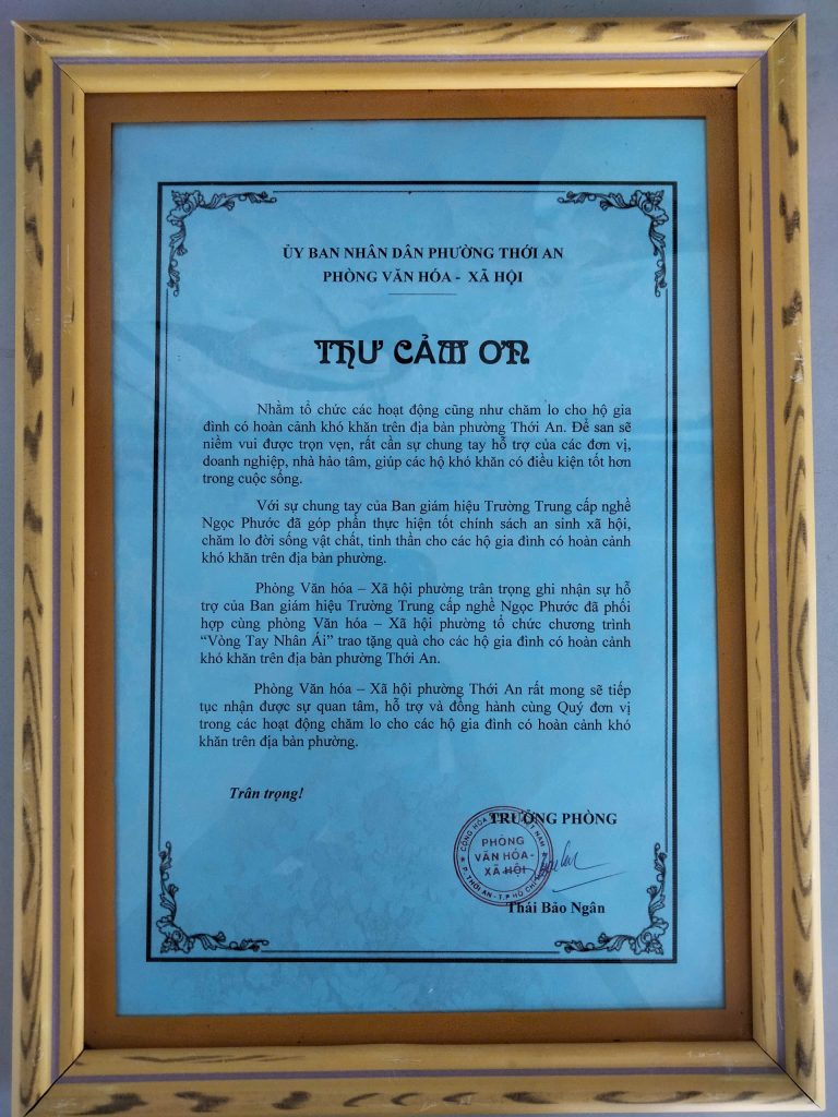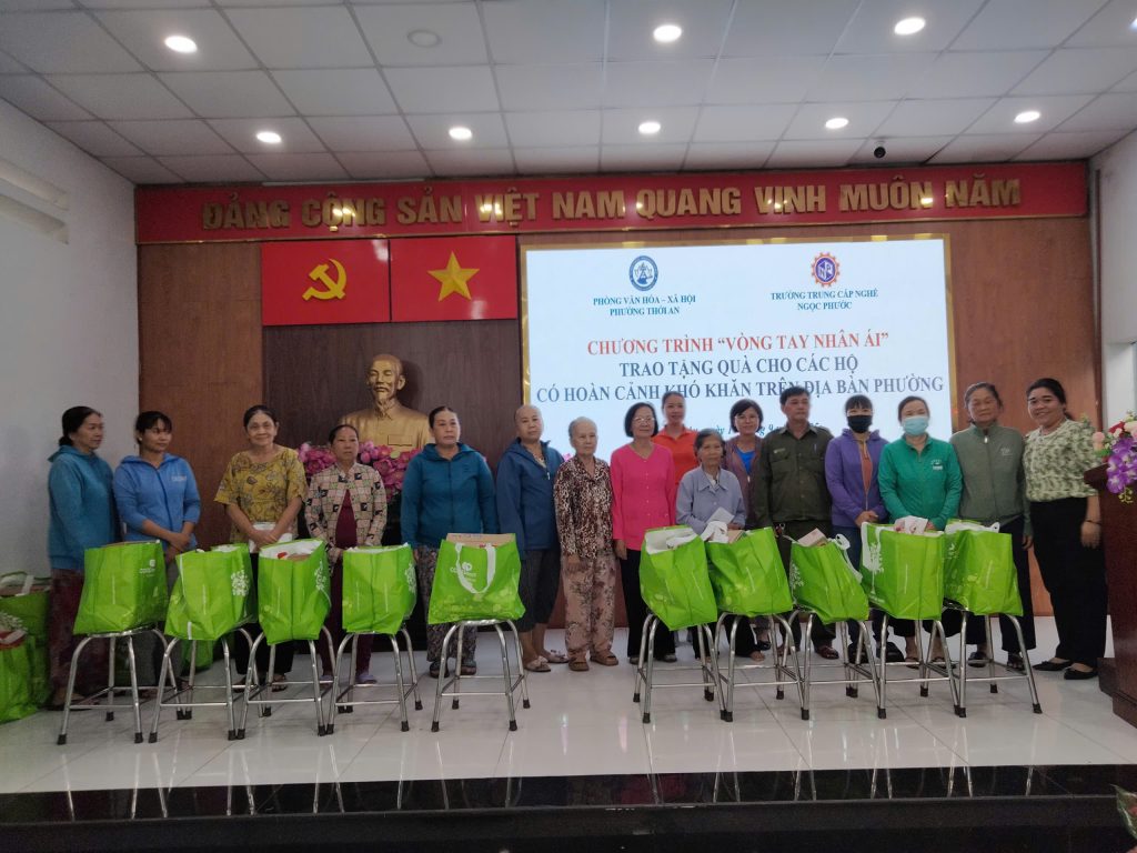 Vào lúc 16h ngày 17/09/2025, Trường Trung Cấp Ngọc Phước phối hợp cùng Phòng Văn hóa – Xã hội Phường Thới An tổ chức chương trình “Vòng tay nhân ái – Trao tặng quà cho các hộ có hoàn cảnh khó khăn trên địa bàn Phường”.