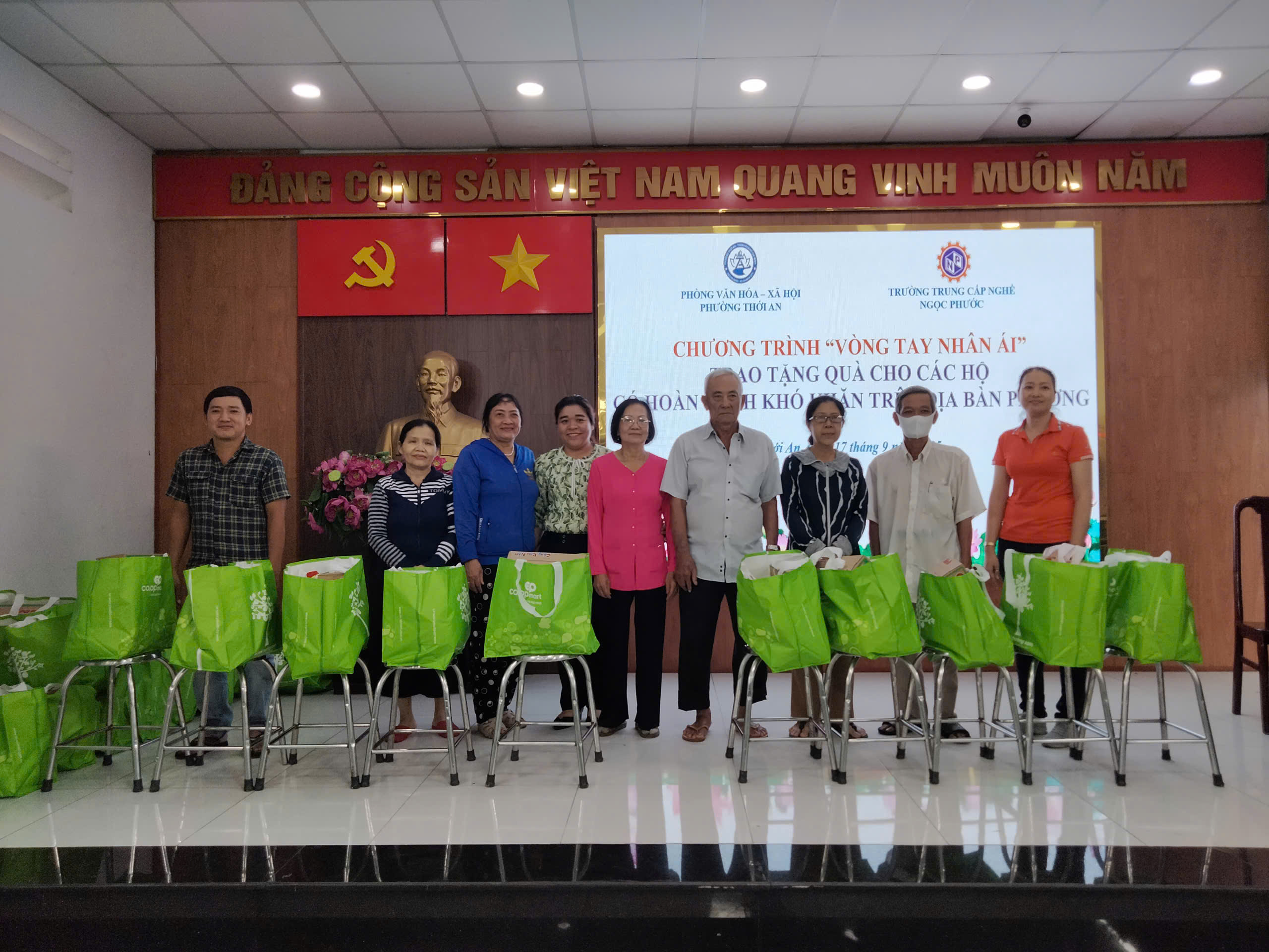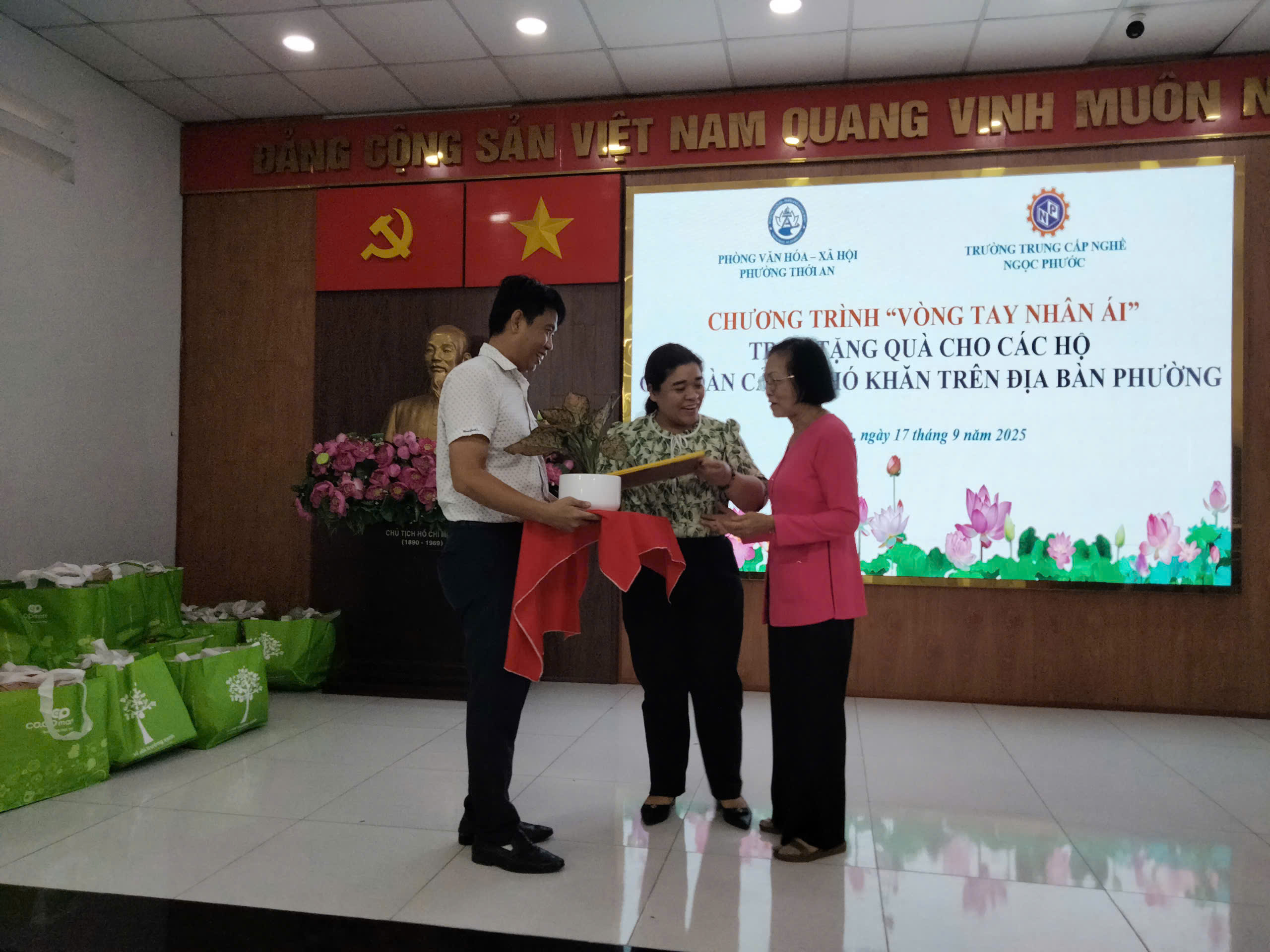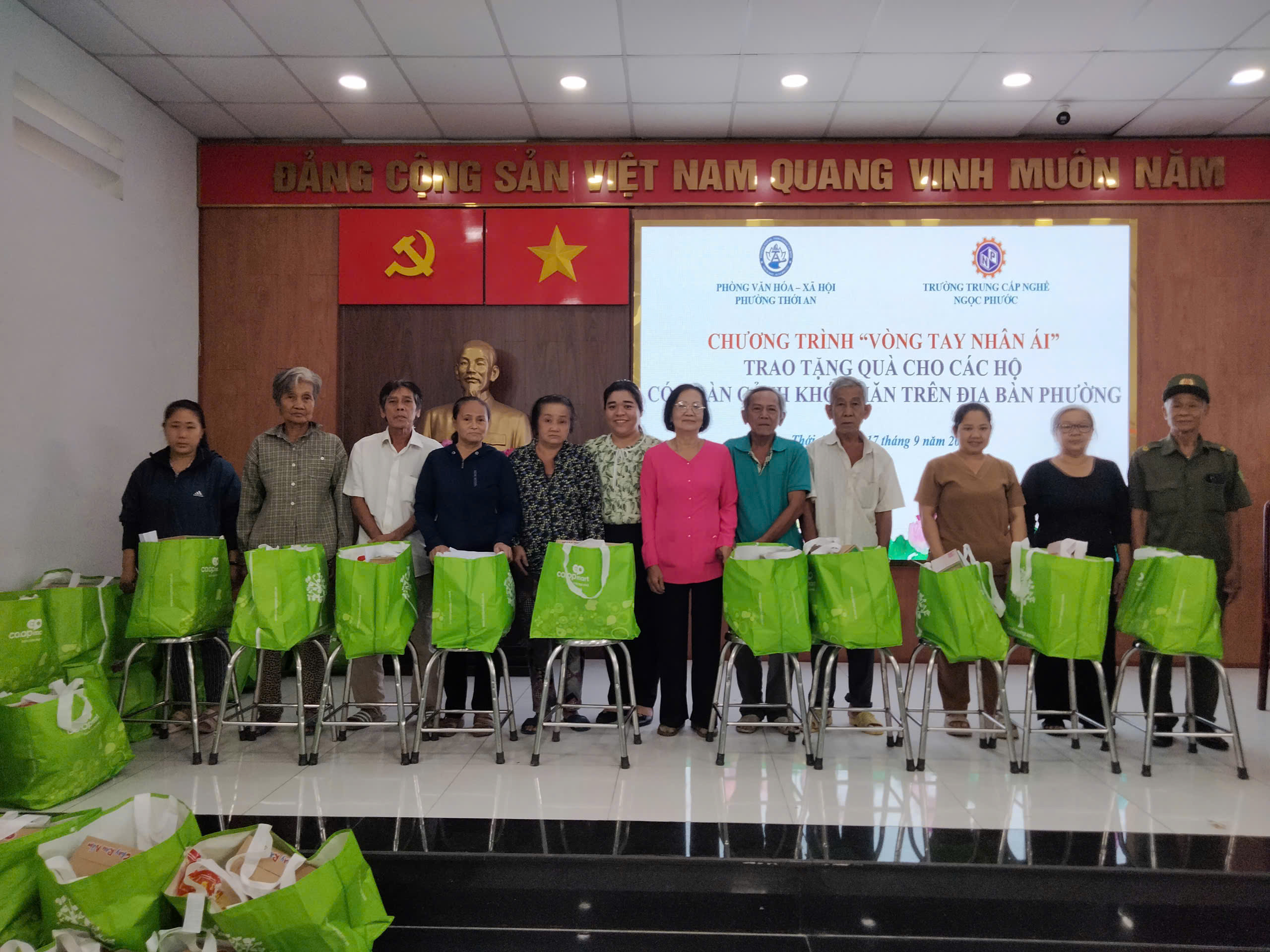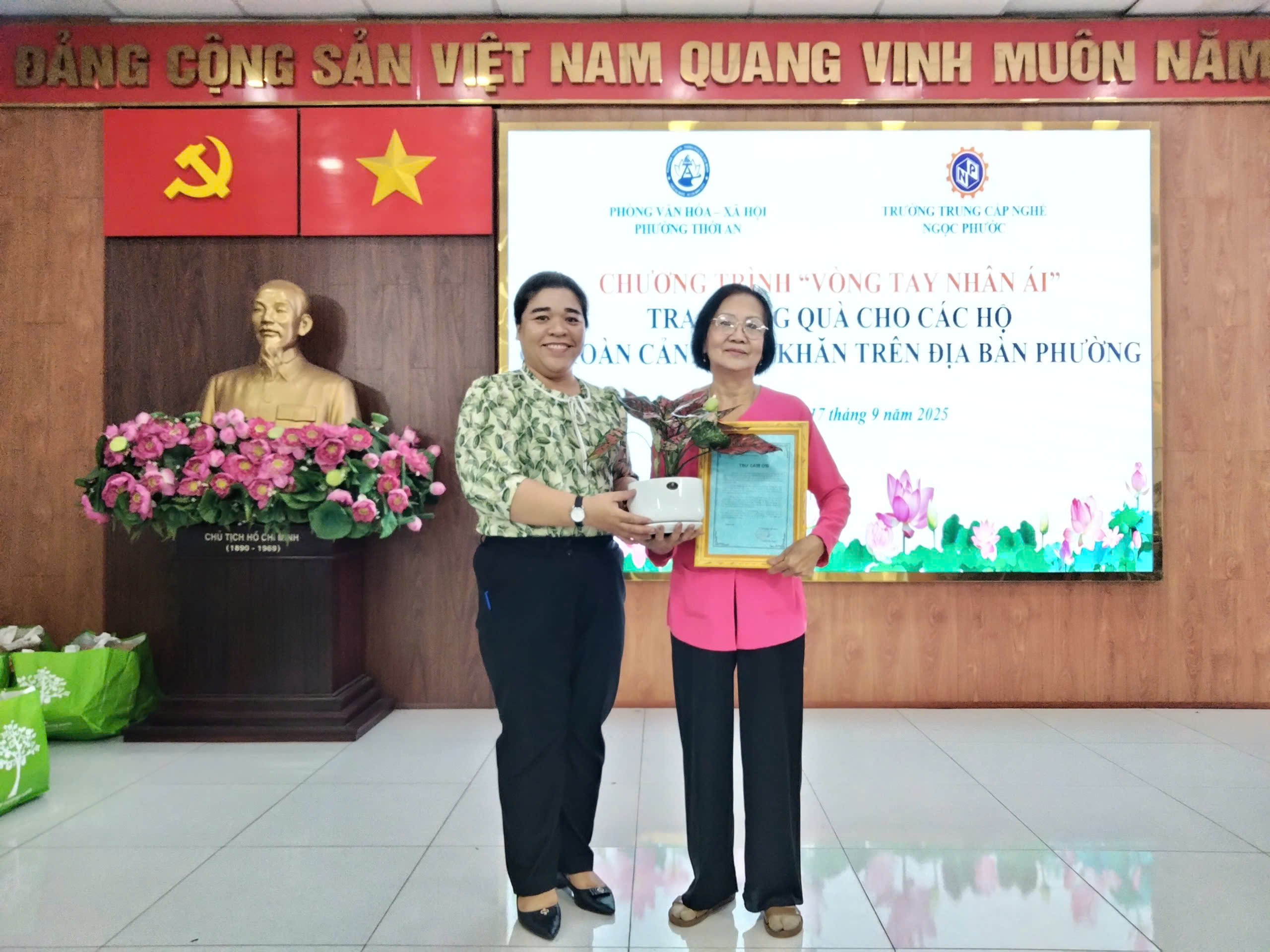 Vào lúc 16h ngày 17/09/2025, Trường Trung Cấp Ngọc Phước phối hợp cùng Phòng Văn hóa – Xã hội Phường Thới An tổ chức chương trình “Vòng tay nhân ái – Trao tặng quà cho các hộ có hoàn cảnh khó khăn trên địa bàn Phường”.