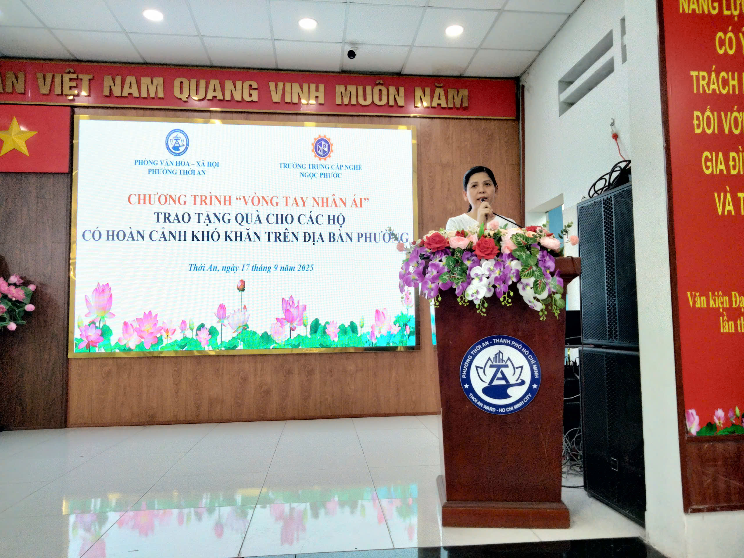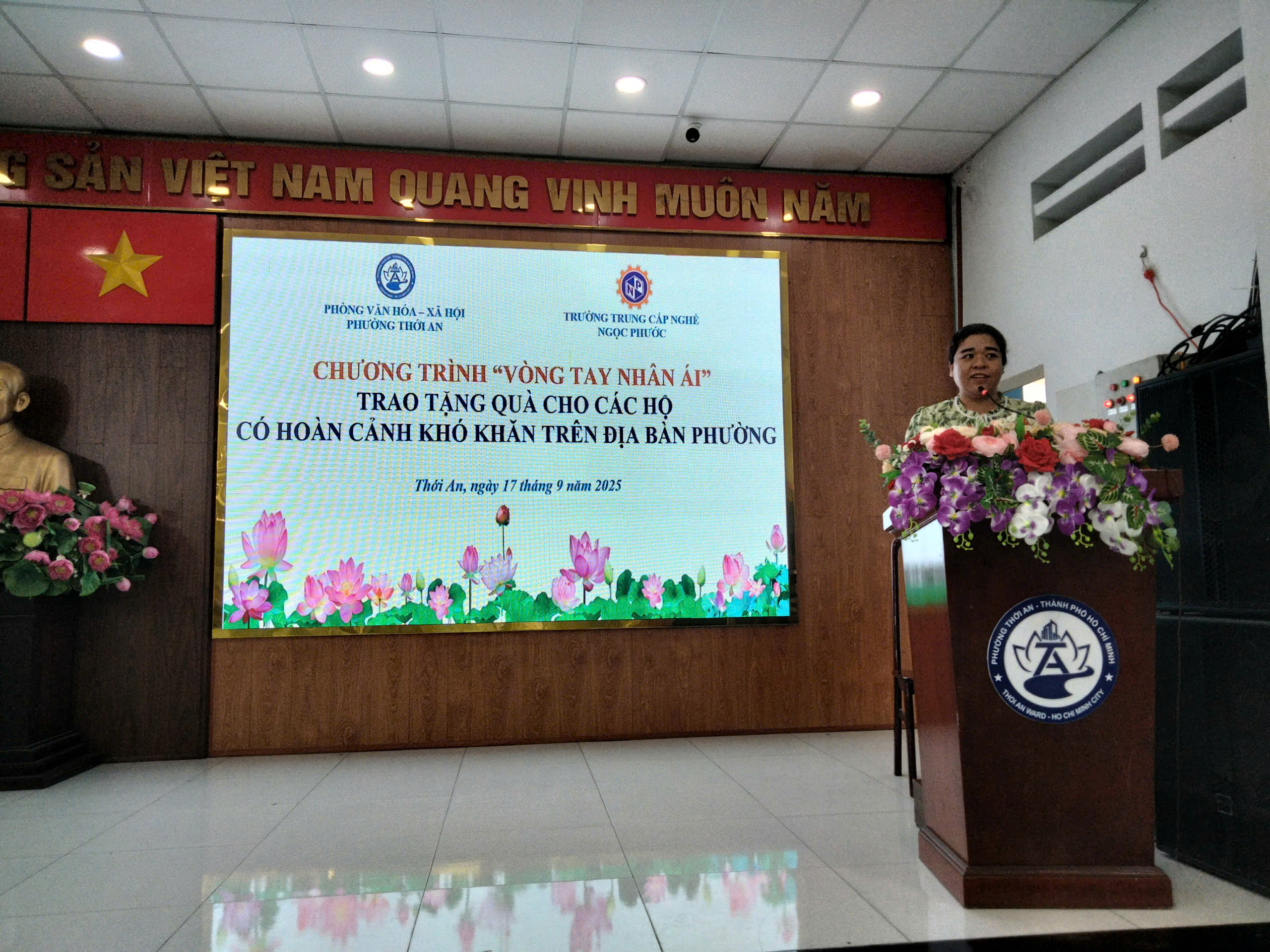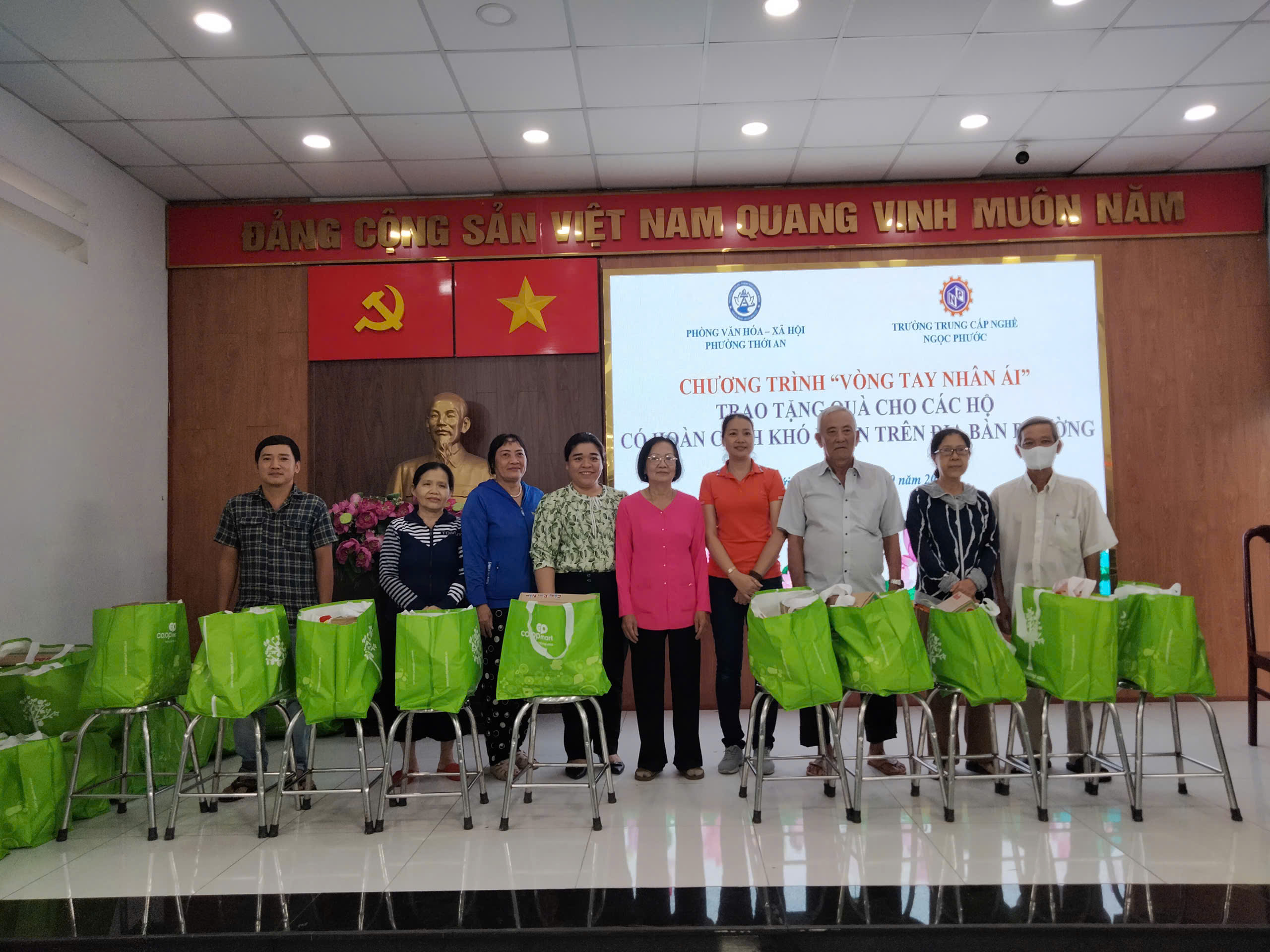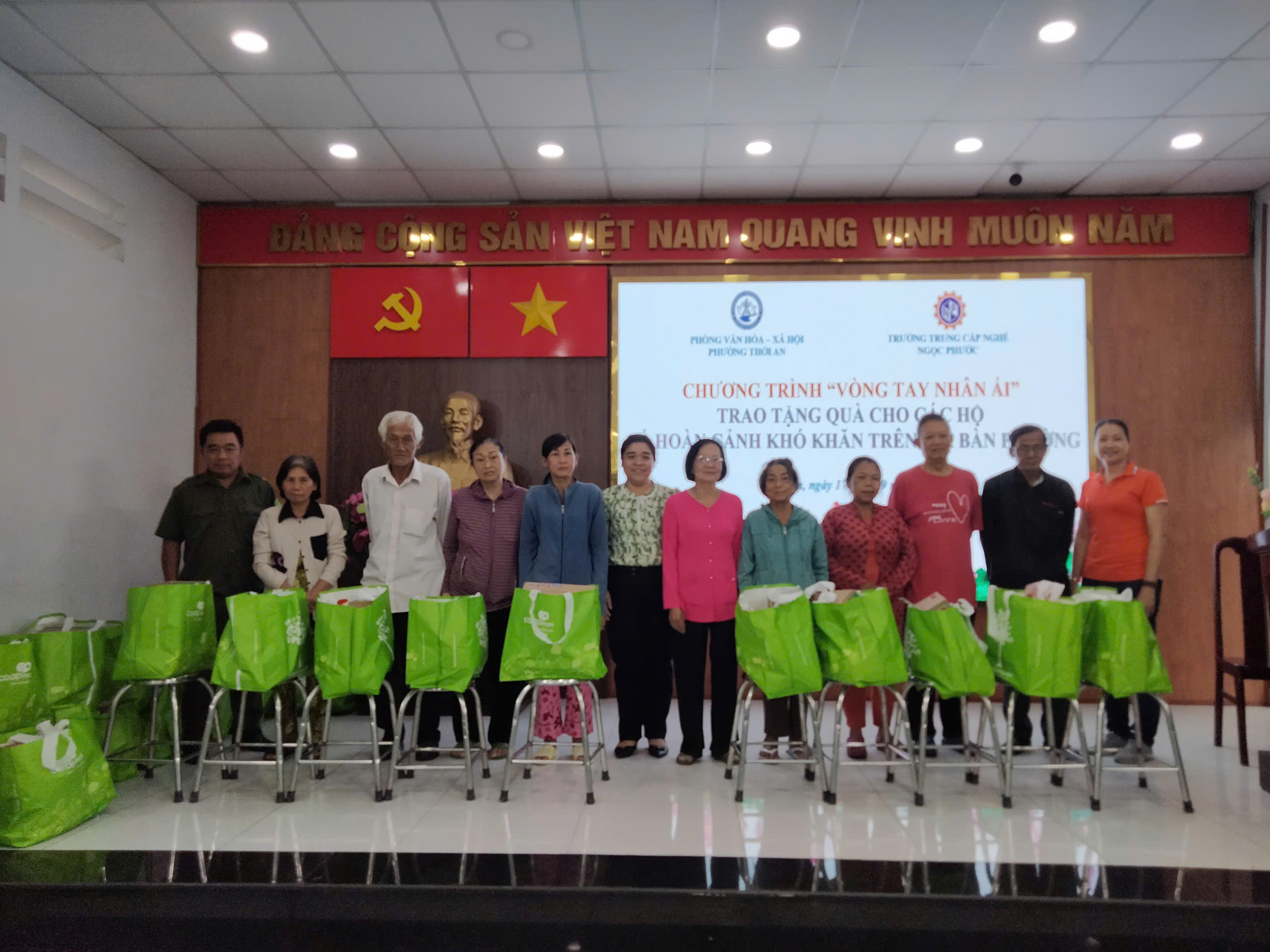 Vào lúc 16h ngày 17/09/2025, Trường Trung Cấp Ngọc Phước phối hợp cùng Phòng Văn hóa – Xã hội Phường Thới An tổ chức chương trình “Vòng tay nhân ái – Trao tặng quà cho các hộ có hoàn cảnh khó khăn trên địa bàn Phường”.