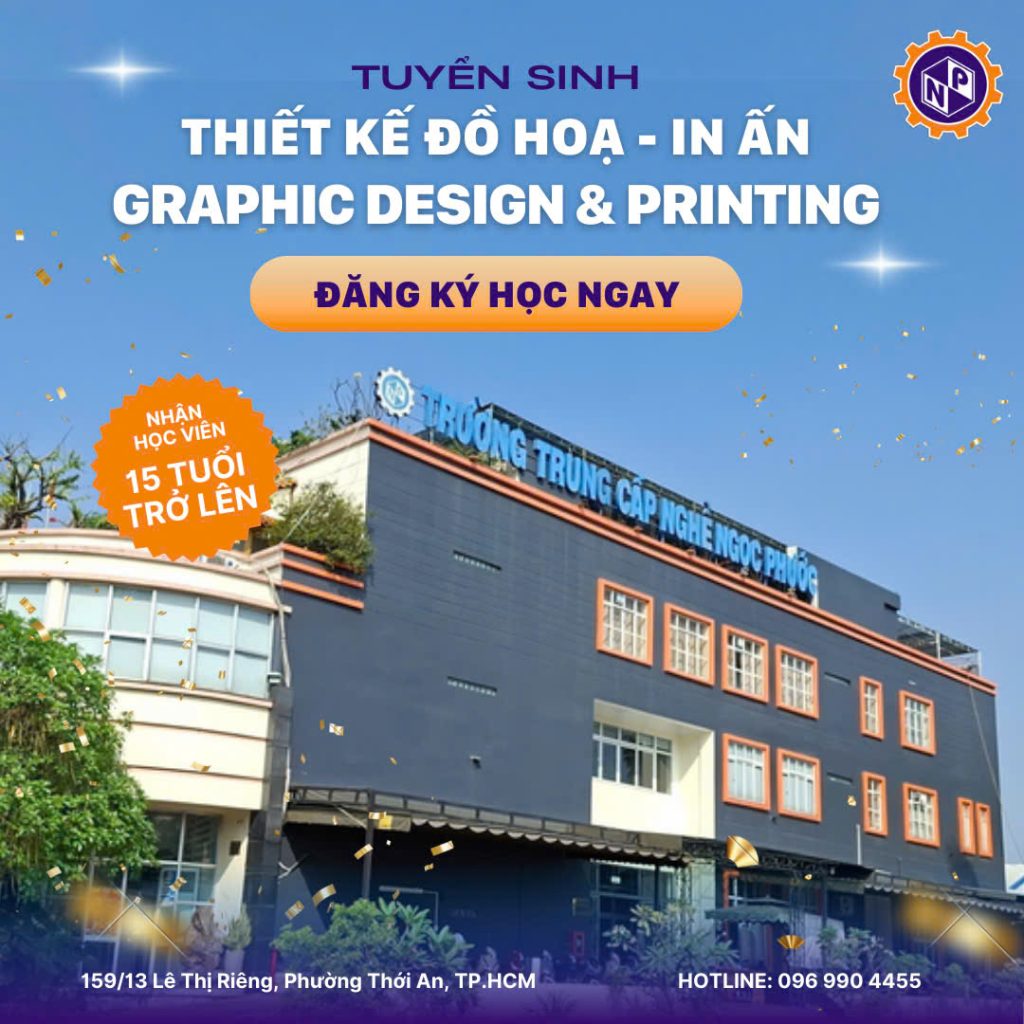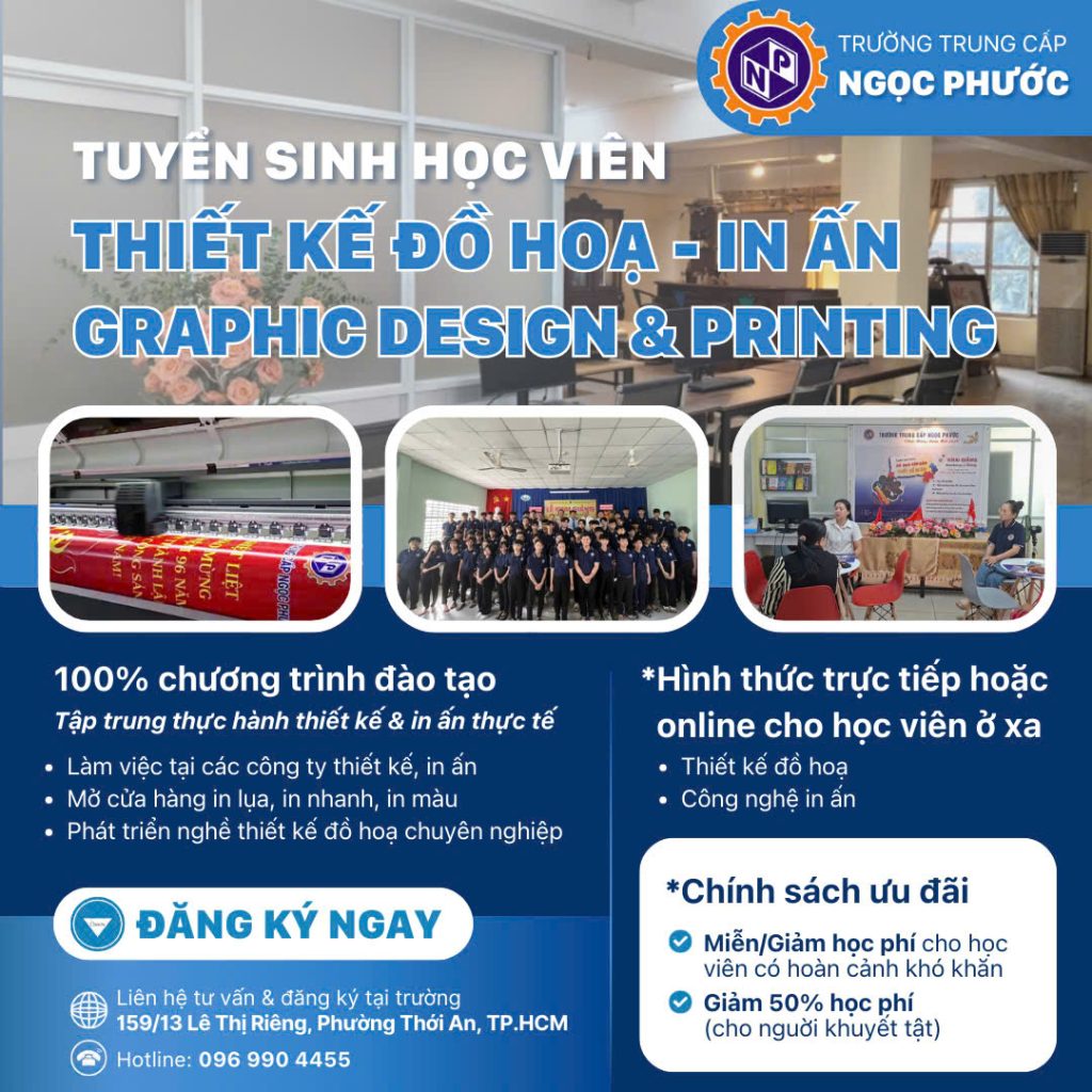Trường Trung cấp Ngọc Phước thông báo tuyển sinh Lớp Thiết kế Đồ họa – In ấn (Graphic Design & Printing) với chương trình đào tạo 3 tháng, tập trung “Thực hành – Ứng dụng thực tế – Gắn liền sản xuất doanh nghiệp”.