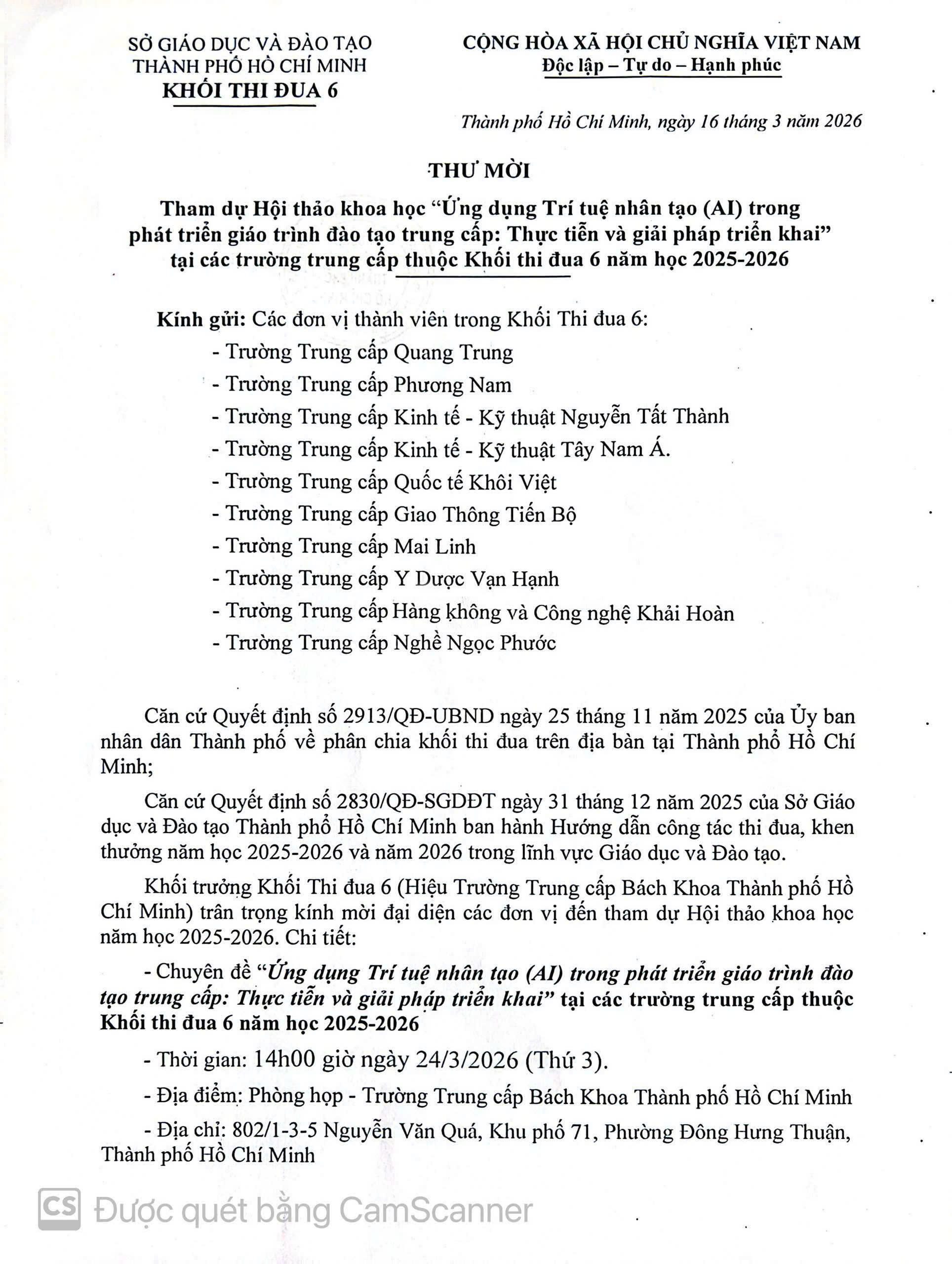 Hội thảo thuộc Khối thi đua 6, năm học 2025–2026, được tổ chức tại Trường Trung cấp Bách khoa TP.HCM (802/1-3-5 Nguyễn Văn Quá, Phường Đông Hưng Thuận, TP.HCM) do Sở Giáo dục & Đào tạo – Khối thi đua 6 chủ trì.